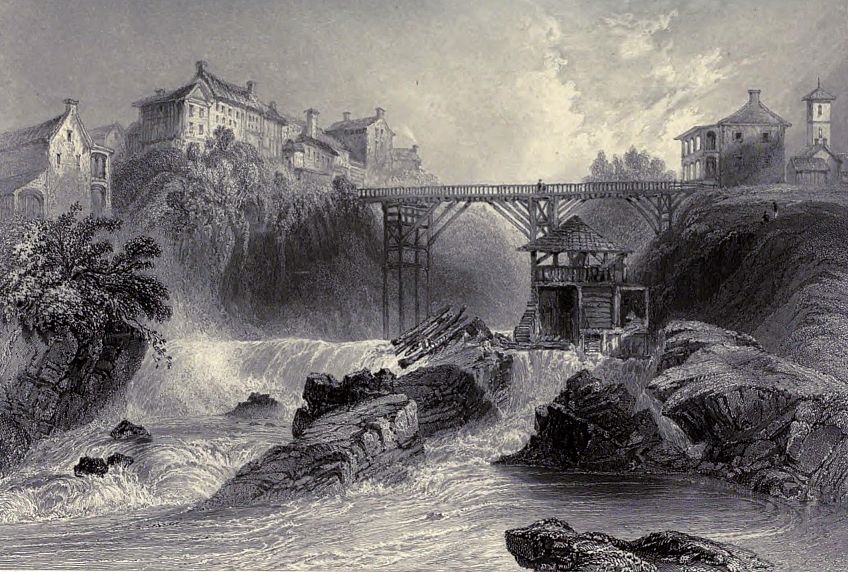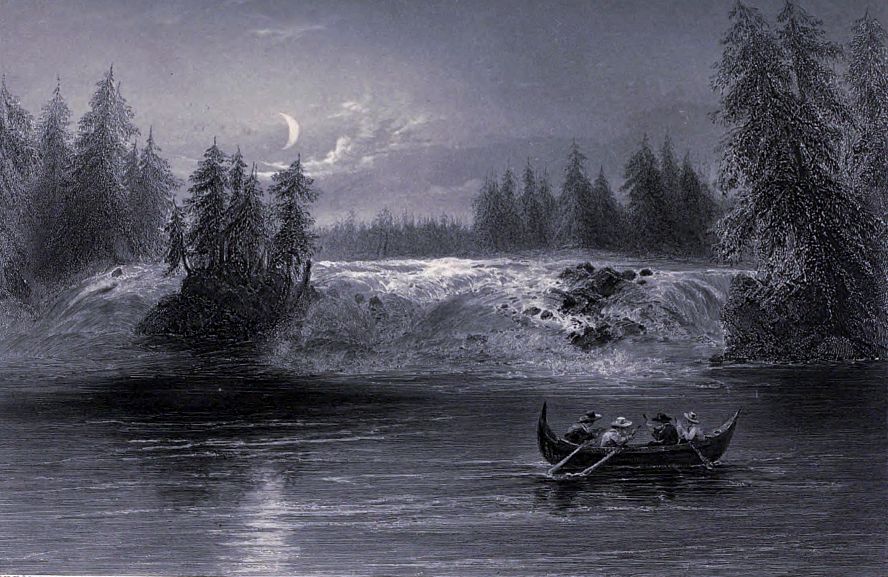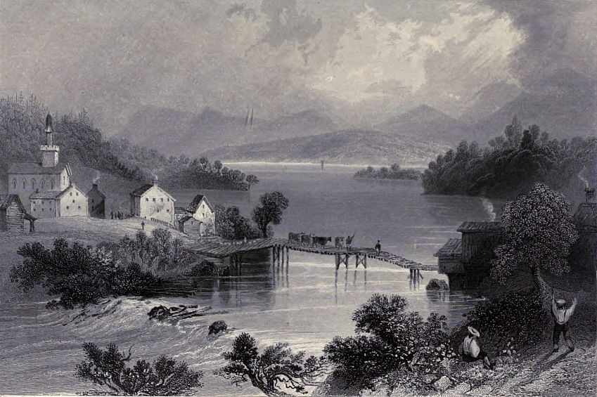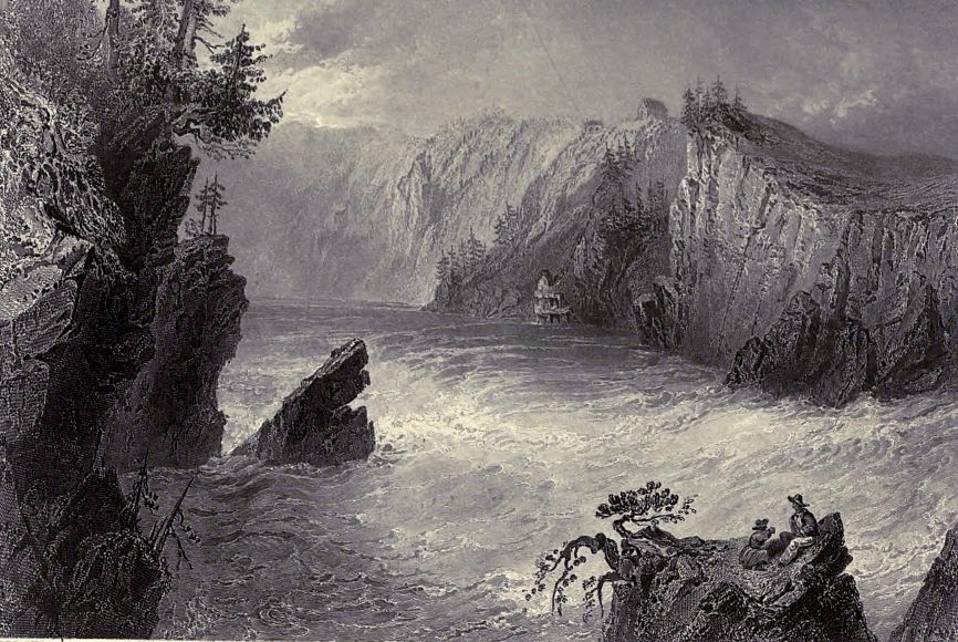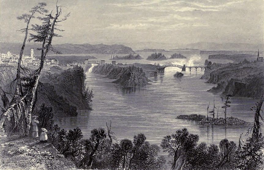 About six miles below this point commences Lake Chaudière, an expanse eighteen miles long, and, like the former, terminating in rapids, succeeded by falls. These last, called the Great and Little Chaudière (Kettle), are on a larger scale, 60 feet high and 212 broad. The descending torrent, striking on a great circular rock, is thrown up in clouds of spray, which conceal the bottom of the fall, and often rise in revolving columns high above its summit. A great portion of the water being unaccounted for, is believed to escape through subterraneous channels. Immediately below, where the stream still rolls in rapid eddies, a bridge has been thrown across. The difficulties of the undertaking were overcome by dividing the structure into four parts, consisting of different materials. The broadest span is stretched by means of a hempen fabric, composed of three-inch cables, forming an inverted segment of a circle, the lowest point of which is only seven feet above the torrent. But at no time can it be passed without a feeling of peril.