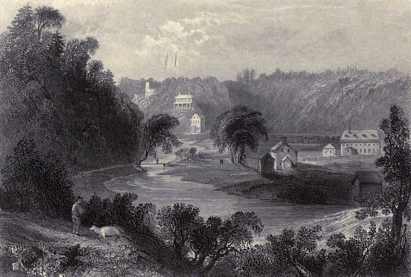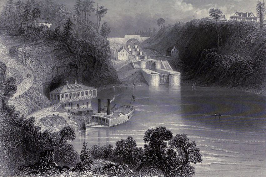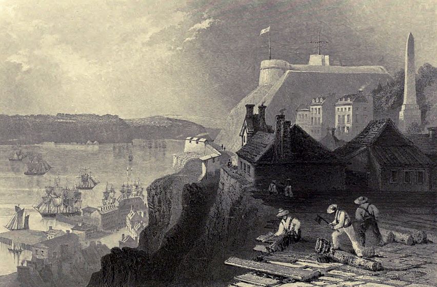 The lower town is a narrow crowded range of buildings, extending along the base of the precipice. The spot on which it stands is entirely the creation of human industry; for, originally, the waves at high water beat the very foot of the rock. Wharfs, however, have been founded, and carried out into the river, though nowhere farther than 240 yards, and on these streets have been erected. So limited, indeed, is the space, that the quarter beyond Cape Diamond communicates with the rest only by a path cut in many places through the solid rock. This part of Quebec is compared to the most irregular and confused districts of Edinburgh. It is connected with the upper town by what is called Mountain-street, which formerly was not passable for carriages without extreme difficulty, but has of late been much improved. The Breakneck-stairs, as they are denominated, are more commodious for foot passengers. Besides extensive wharfs, the lower town contains the Quebec bank, which, in addition to apartments for its appropriate purpose, has others for a fire assurance company, and a subscription library, the most extensive and valuable in Canada. The government warehouses are all spacious, and the custom-house having been found inconvenient, the foundation-stone of a new one was laid in 1831. Amid wharfs lately formed on the flat beach of the St. Charles, has been erected the exchange building, an elegant structure, containing a spacious reading room, and several others devoted to commercial purposes. Projects are in contemplation for erecting a pier, which would also serve as a bridge across the estuary; an improvement, which, while it would afford ample space for the extension of the lower town, would enable the largest vessels and rafts to lie in security, instead of resorting, as at present, to caves in the neighbourhood.