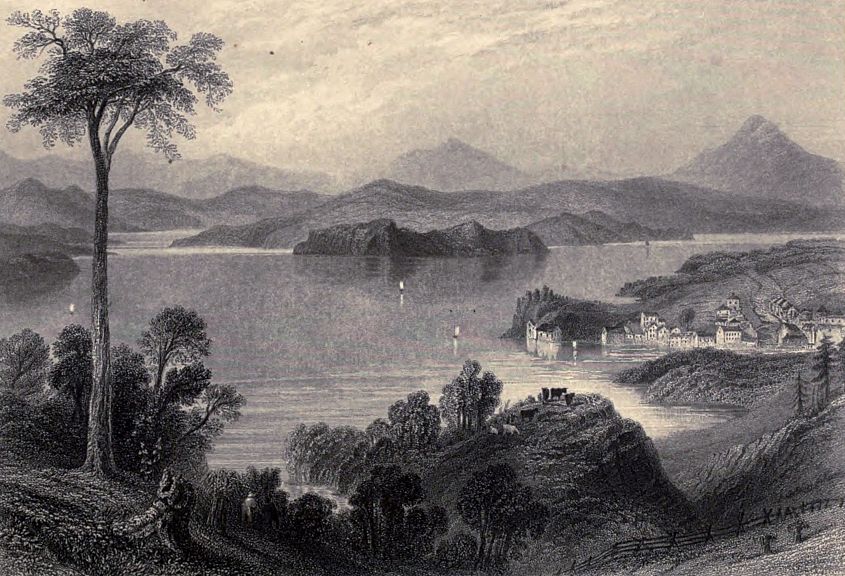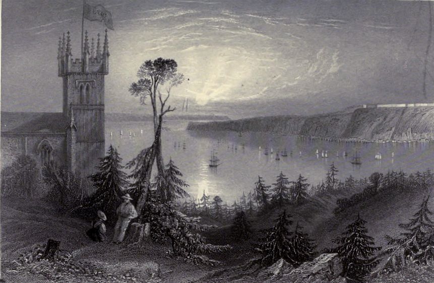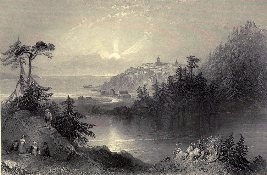 The scenery of Quebec and the surrounding country is described by all travellers as rivaling in picturesque beauty the most favoured parts of the earth. The navigator who ascends the St. Lawrence, after he has passed the Isle of Orleans, and entered the broad basin already mentioned, where he first comes in sight of this capital, is struck with intense admiration. He sees its citadel crowning a lofty cliff, its castle and batteries overhanging a range of formidable steeps, the river crowded with numerous vessels of every form and size, from the huge timber-raft to the bark canoe. The fall of Montmorency appears dashing its white foam almost to the clouds, and on each side is a long range of fertile and beautiful shore. On ascending Cape Diamond, a still grander and more extensive panorama bursts upon his view, combining all the boldness of rude with the richness of cultivated nature. Up and down the magnificent stream of the St. Lawrence is a reach of more than forty miles, on which sails almost innumerable are in ceaseless movement. Below is the beautiful Isle of Orleans, while the opposite coast is diversified by a great variety of natural and cultivated scenery. To the north appears the river St. Charles, winding amid fertile valleys and hills, with villages hanging on their sides, while the prospect is closed by a bold screen of mountains. Mr. Weld prefers the views from the upper town, where, though fewer objects are seen, they appear more distinct and brilliant. This traveller, after visiting a great part of Europe and America, gives to them a preference over every thing he had observed on either continent. Mr. McGregor considers them similar, but much superior, to those from the castles of Edinburgh and Stirling.