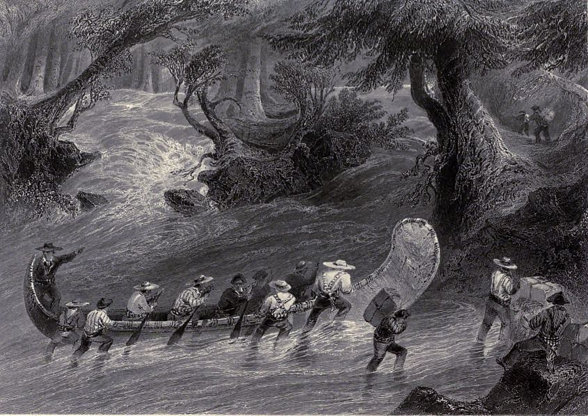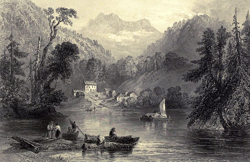 The upper part of the river beyond the falls and Portage des Allumettes, is used by the fur-traders, who have a post also in Lake Temiscaming, more than 350 miles above the junction of the Ottawa with the St. Lawrence; but this tract has never been surveyed, nor even accurately described. Up to the Portage, it is regularly frequented by the lumberers, who find valuable supplies of pine and oak, which they contrive to float down in rafts, through all obstructions. At the Allumettes the stream separates into two channels, enclosing an island fifteen miles long, and forming three small lakes, called the Allumettes, the Mud, and the Musk Rat. On the latter is one solitary farm, said to be in a prosperous condition. Eight miles below the junction of these channels is Fort Coulange, where the Hudson’s Bay Company have a post, near which is one well-cultivated settlement. Four or five miles down, another division of the stream forms an island of about twenty miles long; but the two channels are much impeded by falls and rapids. The northern, which is the more practicable, has four portages within a few miles of the port of junction, and there is another five miles below it. The falls are not above eight or ten feet high, but they are much broken by masses of rock, and have a very wild appearance.