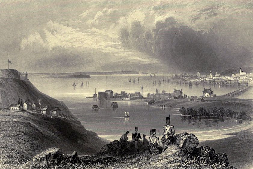 In the midst of this fine landscape stands Quebec, the capital of British America, it is seated on a promontory stretching out into the river, which, by means of it and Point Levi on the opposite side, is narrowed to about three quarters of a mile, though immediately below it spreads out into a wide basin. Cape Diamond, the most elevated point of the city, is reckoned by an eminent traveller 1000 feet high; a proof of the fallacious nature of such estimates, since the more accurate observations of Bouchette fixes it at 345. Above a hundred feet lower is an elevated plain, on which are built the castle and the whole of what is termed the upper town. Thence a perpendicular steep of above 200 feet descends to the banks of the St. Lawrence; and in the narrow interval between this precipice and the river is the lower town, the crowded seat of business and shipping.