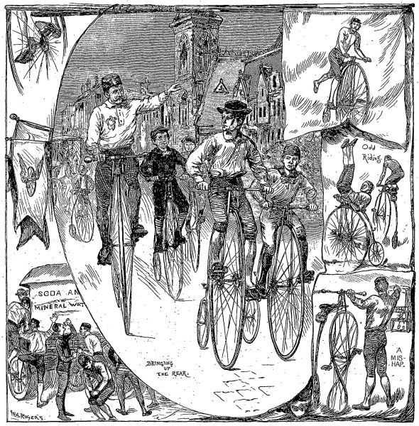 While most of the wheelmen in this gay procession were men, its rear was brought up by some fifteen or twenty boys, who, under charge of one of the most experienced and graceful riders of the country, made a most creditable show, and proved themselves to be good and careful riders. The picture on the preceding page shows the contrast between them on their 36 or 40 inch bicycles, and their tall Captain on his 56-inch machine.