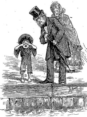 | Kind-hearted Old Gentleman. "What are you crying for, Bub?" |