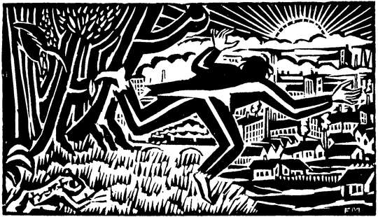 „Am Bethlehemer Tor!“ dachte Ahasverus und fing an zu laufen. Hier und da wurde ein Fenster aufgestoßen: „Was ist los? — Ist der Feind im Land?“ Ängstliche Schlafmützen fragten es einander und riefen hinter Ahasverus her. Und er hielt immer nur sein Messer hoch wie ein Verrückter: „Jungens! . . . der Nazarener . . . es geht los . . .“