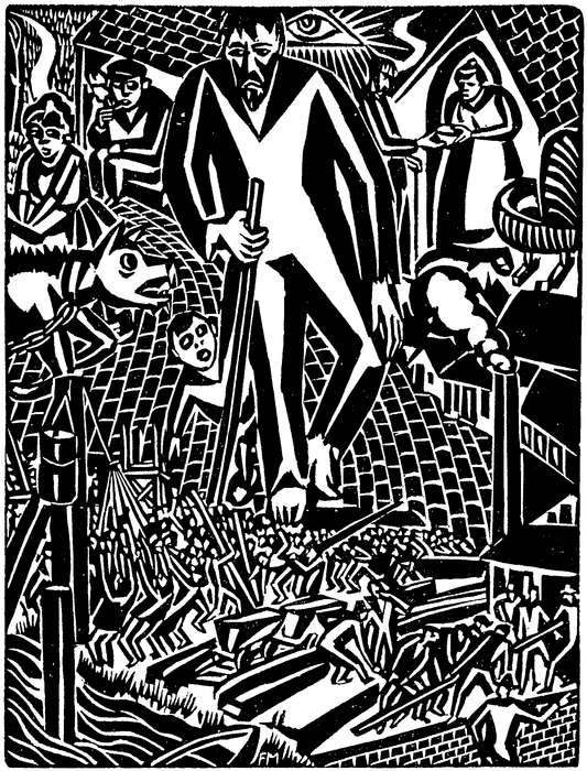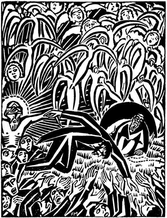 Und dem Wirt der Ausspannung „Zur fröhlichen Einkehr“, der über der Fensterbrüstung lag, erzählte der Barbier von der Ecke, wie Petrus — „es ist schrecklich!“ — dem Judas den Kopf glatt abgehauen hatte.