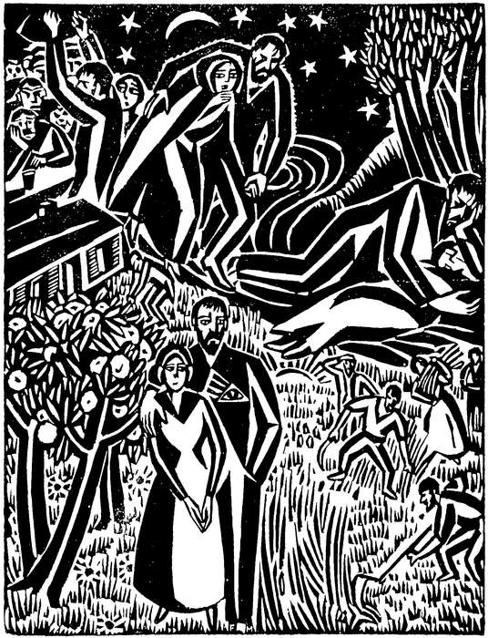 Er war schon draußen, sein Messer in der Faust. Die Frühlingsnacht war pechschwarz, als zöge ein Unwetter herauf. Ahasverus schauderte vor Kälte, und sein Kopf glühte. Das Geläute und Getöse hielt an, — wo war es? Er schwankte einen Augenblick, — er wußte nicht, wohin. Etwas von dem Traum wirkte fort in ihm, und er wollte zum Tempel, aber von einer anderen Seite stieg nun ein gewaltiges, wirres, vielstimmiges Geschrei auf und wuchs zu einer Wolke von Lärm.