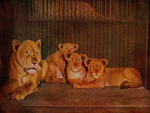 The Cubs are usually two or three and the Lioness treats them with great tenderness. They play together like Kittens. In well-managed zoological gardens Lions are now bred as carefully as Dogs; and even in circuses, where the animals have but little room and often insufficient nourishment, they are born and sometimes grow up. The cubs are at first rather clumsy. They are born with their eyes open and are about half the size of a Cat. Towards the close of the first year they are about the size of a strong Dog. In the third year the mane begins to appear on the male, but full growth and distinction of sex, according to Brehm, are only completed in the sixth or seventh year. Lions in captivity have lived to be seventy years old.