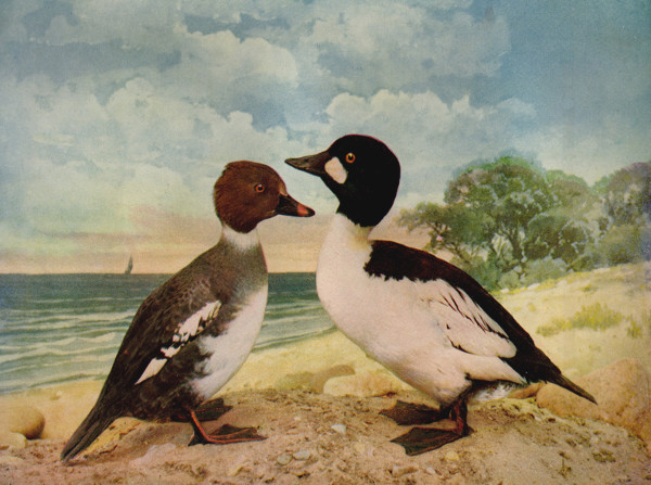 FOR beauty this bird will compare favorably with any of the family except the Wood Duck, whose colors are more various and brilliant. Whistler is the name by which it is more commonly known, from the peculiar noise of wings made while flying. In spite of its short, heavy body and small wings, it covers immense distances, ninety miles an hour being the speed credited to it by Audubon, who, however, was not always accurate in his calculations. It is an abundant species throughout the fur countries, where it frequents the rivers and fresh-water lakes in great numbers. It breeds as far north as Alaska, where, on the Yukon, it nests about the middle of June. Like the Wood Duck, it makes its nest in hollow trees and decayed trunks. This consists of grass, leaves, and moss, lined with down from the bird's breast. The eggs are from six to ten in number, and ashy green in color.