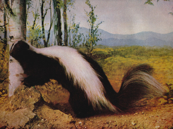 The Skunk is a much respected animal, both man and beast preferring to go around him rather than over him, and many amusing anecdotes are related by hunters and naturalists, which lead us to believe that he does not always come out second best in an encounter. When in search of food he is so bold that he can be approached without difficulty, and he wears a look of innocence that effectually deceives the uninitiated, and brings about very unexpected results.