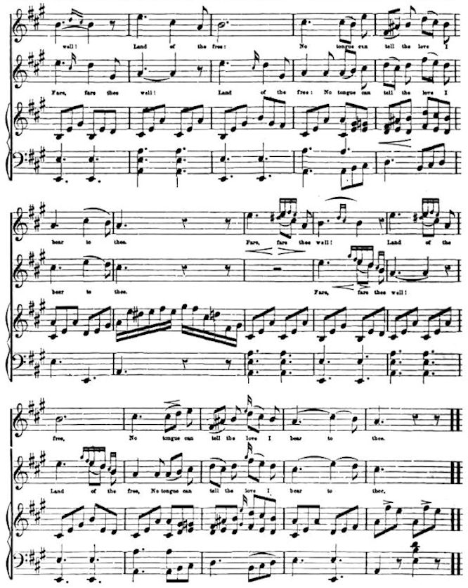 Fare, fare thee well! Land of the free: No tongue can tell the love I
