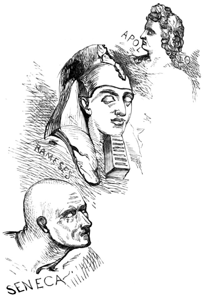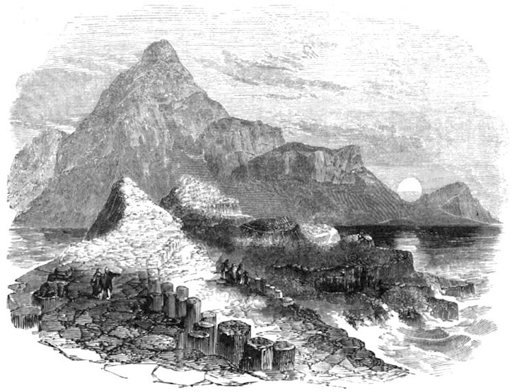 The average height of the basaltic columns constituting the Giant’s Causeway is thirty feet; but the whole neighborhood is strewn with detached fragments of the same species of rock, that in their picturesque confusion seem the broken pillars of some ruined temple. These columns in combination, these heptagons, hexagons, octagons and triangles all joined in perfect symmetry, as if hewn for corresponding measurements, form, when you have climbed the rocky ascent to their level summit, a tessellated pavement, where one may promenade in scorn of the fierce waves that incessantly dash against their base, as if they sought to hurl the firm rocks into oblivion. It is quite amusing to listen to the wonderful harangues of the numerous barefooted urchins that follow you all the way along the shore, offering themselves for guides, and their tongues for teachers. They were all born within sight of the “auld Giant’s” dominions, and the only history they ever learned is comprised in wild legends about the stones and crannies that the giant once ruled. From morning to evening they walk before you, behind you, and seem to rise from the stones on every side of you, offering their “spacermens” of the “Giant’s Punch Bowl,” “his honor’s walking-stick,” and various other remarkable relics, “the very last” of which has been sold and resold for twenty years back, and will be for twenty years to come, to every visitor who will “lend them the loan of a sixpence to break their fast with.”