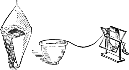 The Mouse in the Trap.—Cut a piece of cardboard of the size of a penny, and paint on one side a mouse, and on the other a trap; fasten two pieces of thread one on each side at opposite points of the card, so that the card can be made to revolve by twirling the threads with the finger and thumb. While the toy is in its revolution, the mouse will be seen inside the trap. Many others may be made upon the same principle.