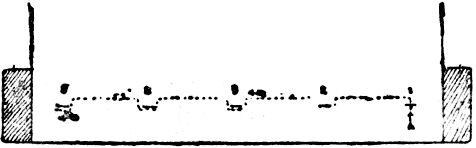 By this time the other boys became interested. They began to put bars in their own yards, and the little fellow had to superintend the operation and give instructions. The uprights should be about three by three, and planted with side braces. The post-holes should be at least three Pg 13 feet deep, and after the posts are set, filled in with stones and earth firmly stamped down. The bar must be just a couple of inches out of one’s reach standing under it flat footed. Half a dozen private bars resulted in a gymnasium in an empty stable loft, equipped with a bar, a ladder, and two trapezes. The little fellow watched his arms and legs with great concern, and could not for the life of him see that they were getting any bigger.