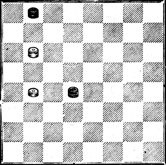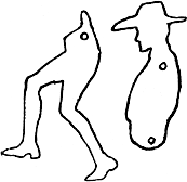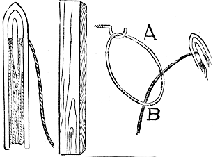 The Skip-Jack.—The skip-jack is made out of the merry-thought of a goose. A strong doubled string must be tied at the two ends of the bone, and a piece of wood about three inches long put between the strings, as shown in the illustration, and twisted round until the string has the force of a spring. A bit of shoemaker’s wax should then be put in the hollow of the bone at the place where the end of the piece of wood touches, and when the wood is pressed slightly on the wax the toy is set. The wood sticks only a very short time, and then springs forcibly up. The Pg 414 skip-jack is placed on the ground with the wax downwards. Upon this principle toy frogs are made sometimes.