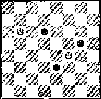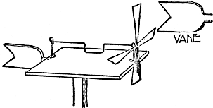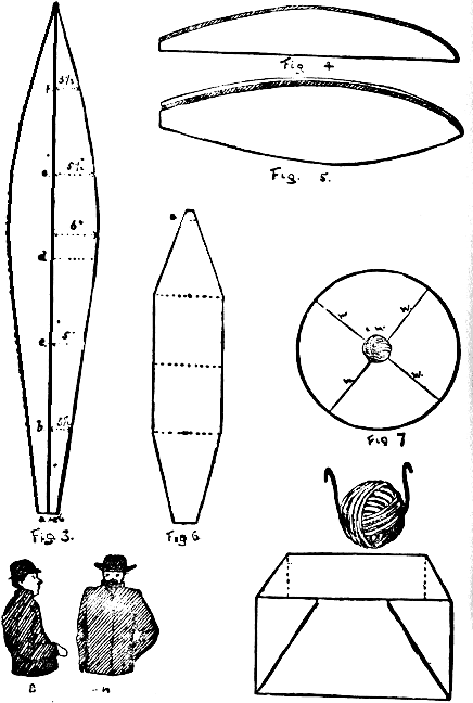 The method of fixing the four arms into one piece is shown in Fig. 3. A hole should now be bored exactly in the centre at the crossing of the arms. The platform upon which the figure of the woodman will stand, shown in Fig. 4, consists of a piece of wood half an inch thick, six Pg 412 inches wide and twelve inches long. At each end is screwed a block to hold the shaft which communicates the movement of the sails to the figure. This shaft is a piece of strong wire fifteen inches long, bent into a crank, as shown in the diagram, and working round and round in the two blocks. The end of the wire that comes through the centre of the windmill sails should be bent up or down to prevent it from slipping out of position. The vane, which will cause the mill to keep in the right position whichever way the wind blows, is shown twice in Fig. 4. It is of thin wood, and is fastened to the underside of the platform by means of the little catch, which should be left when the vane is made. The figures whose parts are shown should be cut out of thin wood with a fret-saw, and put together so that the joints turn easily on the pins that are put through them. Two bodies are needed. To adjust the figure take off one side of the body and place the woodman in the act of completing his stroke, with the axe touching the wood, then put a peg or small tack or nail immediately behind the projection on the top of the legs. This will keep his body from bending too far forward. Now let the axe be raised to the beginning of the stroke, and put a peg in front of the projection. The arm is connected with the crank by a piece of wire. You may not Pg 413 find the right place at first, but a few trials will put you right. Bore a hole in the arm, put the wire through, and twist it round to keep it there.