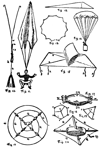 Bend a piece of wire into a circle (Fig. 16) and take two wires across at a right angle. Then place the balls, one by one, in pieces of tissue paper and cover them with meal powder and tie up the ends (Fig. 17), fastening them on the wire, as shown in Fig. 16. A piece of time-fuse, or quickmatch, q, as you want the stars to drop singly or in a shower, must next be passed through each ball packet and connected with lighted time-fuse. Of course the fireworks should hang some distance below the balloon. Crackers or maroons may be arranged as in Figs. 18 and 19, and many other devices invented.