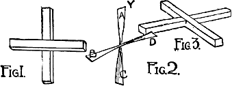 The Working Woodman.—The wind, as well as a pendulum, may be used to make wooden figures move. In Fig. 1 we have two pieces of wood, each an inch thick, an inch and a half wide, and twelve inches long. If we place them as in Fig. 1 we have four arms five and a quarter inches long. Each one of these four arms has now to be cut into a shape to adapt it as a windmill sail; that is it has to be made into a slanting thin blade not more than an Pg 411 eighth of an inch thick, and all the blades must present a similar slope to the wind. As mistakes are likely to occur, here we will endeavour to make the point clear. Take the arm A, Fig. 2. Suppose you have slanted this from x to y. Now imagine that B comes round to A’s position, then it, too, must be sloped in precisely the same way, and not sloped from y to x. The same applies to arms C and D. Imagine them coming to this upright position, and make them all alike as they arrive there.