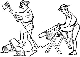 A sawyer may be made upon the same principle, as the illustrations show, or you may have a simple windmill and no figures. Fix the platform and its figures on the top of a pole with a pivot so that they may turn freely in the wind. Before you bore the hole through the platform balance the whole carefully upon the pole or you will put the hole in the wrong place.