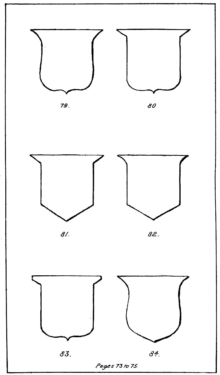 These few explanatory words are necessary to introduce upon the scene the various shaped shields occurring during the centuries which follow. While considering these variations we must bear in mind that they are strongly marked into two great divisions, viz., before the sixteenth century, when shields were in actual use and any alteration in their outline was considered to be an improvement to meet some freshly noticed want; this will be further referred to as instances occur. During and after the sixteenth century, shapes were selected in an arbitrary way, as a matter of taste alone; and hence earlier examples were sometimes exactly adopted, while at other times details and alterations were introduced, just to suit the fancy of the purchaser or artist and the conventional style of the times.