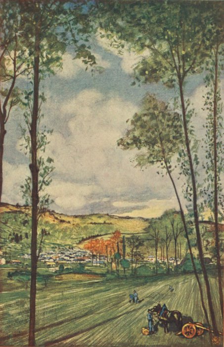 The valley of the River Rille, up which Pont Audemer lies, is of a different style altogether, still it has characteristics in common with other districts. The valley is flat, and from it on each side so steeply rise the fir-crowned hills that in describing them one could almost use the word rectangular. Though the trees are fairly thick there is a ragged, unfinished, rather scrubby look, very often seen in Normandy.