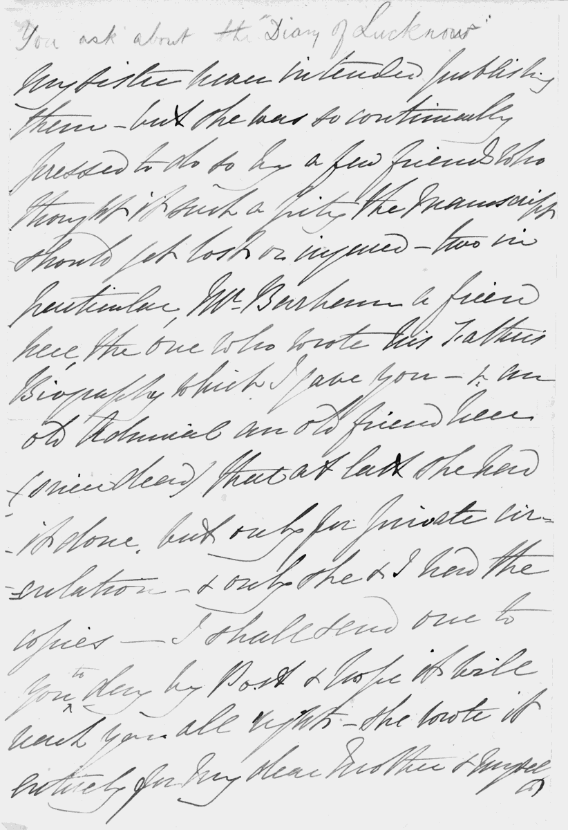 The Writer of the following Diary has frequently been requested to have a few copies printed for circulation amongst her friends; she has now acceded to their request, but wishes it to be understood that the Diary is in its original wording, as it was written by her day by day at Lucknow, with no attempts at embellishment. The names of those who were actors in the fearful scenes have been omitted, from a feeling of delicacy towards some who are still alive.