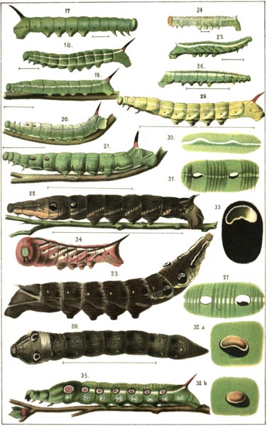 Let us take the species of one genus, e.g. those of Deilephila. The imagines of our European413 species—as far as we know—all live in precisely the same manner; they all fly at twilight,173 showing a preference for the same flowers and very often frequenting the same spots, so that in the haunts of one species the others are almost always to be met with, supposing them to occur in the same locality. They conceal themselves by day in similar places, and are attacked by similar foes.
