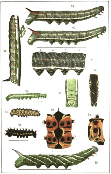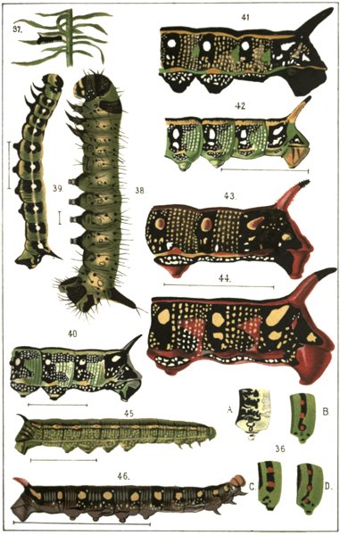 The simpler and, as I am inclined to believe, the older form of the transformation is presented to us in the local variety Ligurica. In the last stage, when 7.5 centimeters long, this form is of a beautiful bright green colour without any trace of black marking174 (Pl. VIII., Fig. 77). The colour of the six orange warts which are situated on each segment is also similar in all specimens, so that this stage is perfectly constant.