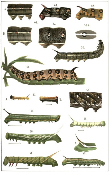 There are a very large number of species which possess very constant imagines and pupæ, but extremely variable larvæ. The following are the cases known to me:—Macroglossa Stellatarum, Fuciformis and Bombyliformis; Chærocampa Elpenor, Celerio, and Nerii; Deilephila Galii, Livornica, Hübn., Hippophaës, Vespertilio, and Zygophylli; Sphinx Convolvuli; Acherontia Atropos; Smerinthus Ocellatus and Tiliæ; Callimorpha Hera; Cucullia Verbasci and Scrophulariæ.