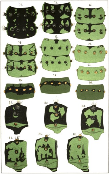 In the blackest specimens there is nothing425 green but the lateral (infra-spiracular) line which was yellow in the preceding stage, and a crescent-shaped streak at the base of the middle warts together with a still smaller crescent at the base of the upper warts (Figs. 71 and 81). These spots become extended in lighter specimens and approximate so as to leave only narrow black bridges, a third spot being added at the posterior edge of the warts (Figs. 72 and 82). The three spots then extend on all sides, still leaving for a long period narrow black lines at the boundaries where their growth has caused them to abut. In this manner there frequently arises on the green ground a true hieroglyphic-like marking (Figs. 85 and 86). Finally the black disappears from the anterior edge and diminishes on the middle line of the back where it still partly remains as a T-shaped figure (Figs. 73 and 74), although generally replaced elsewhere by the green with the exception of small residues.