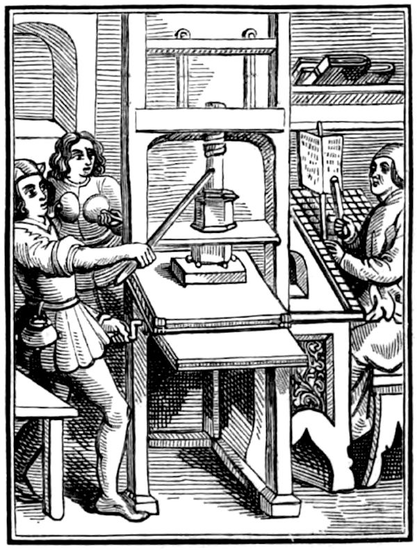 The following cut is a representation of the press in use at this period, and for some considerable time afterward. It is a fac-simile of an engraving of “the press of Jodocus Badius Ascensianus, from the title page of a book printed by him in 1498.”