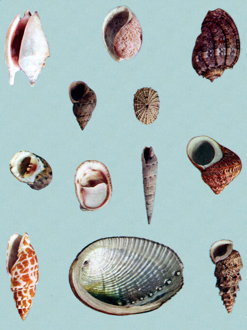 The Marine snails outnumber all of the other mollusks and their shells are far more beautiful, those in the tropics having the most gaudy colors imaginable. The animals are all formed on the same plan although each family has some peculiarity not shared by its relatives. They are found in all parts of the world, and in all climates. While the majority of species live either between tides on near low water, there are not a few which live in the abysses of the ocean and have been dredged at a depth of three thousand fathoms, a distance of over three miles. The average depth at which mollusks are found in any number is about one thousand fathoms. The variability of marine snails is so great that only a few typical forms can be mentioned.