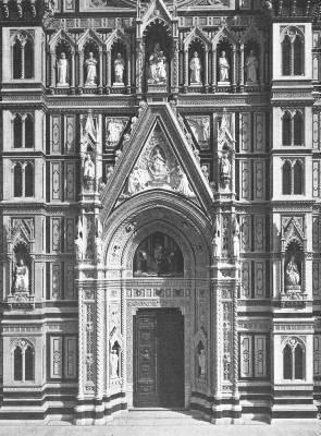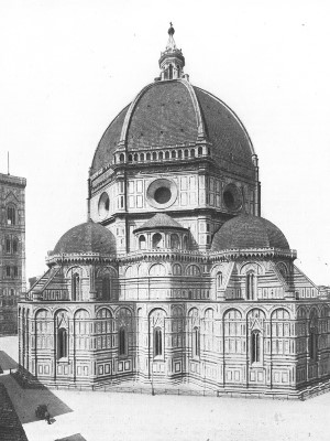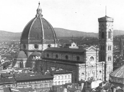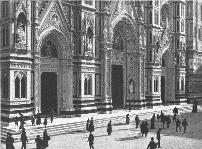 "In the year 1294," wrote Giovanni Villani, who was a youth in Florence at the time, "the city of Florence being in a state of tranquility, the citizens agreed to rebuild the chief church, which was very rude in form and in small proportion to such a city, and that it should be enlarged, and that it should be made all of marble and with carven figures. And the foundation was laid on the day of St. Mary, in September, by the Cardinal Legate of the Pope, in the presence of all the ranks of the Signory of Florence. And it was consecrated to the honor of God and St. Mary, under the name of St. Mary of the Flower (Santa Maria del Fiore). And for the building of the church taxes were ordered, and the Legate and bishops bestowed great indulgences and pardons to everyone who should contribute aid and alms to the work."