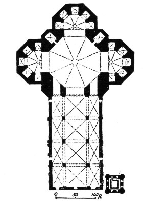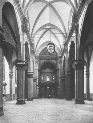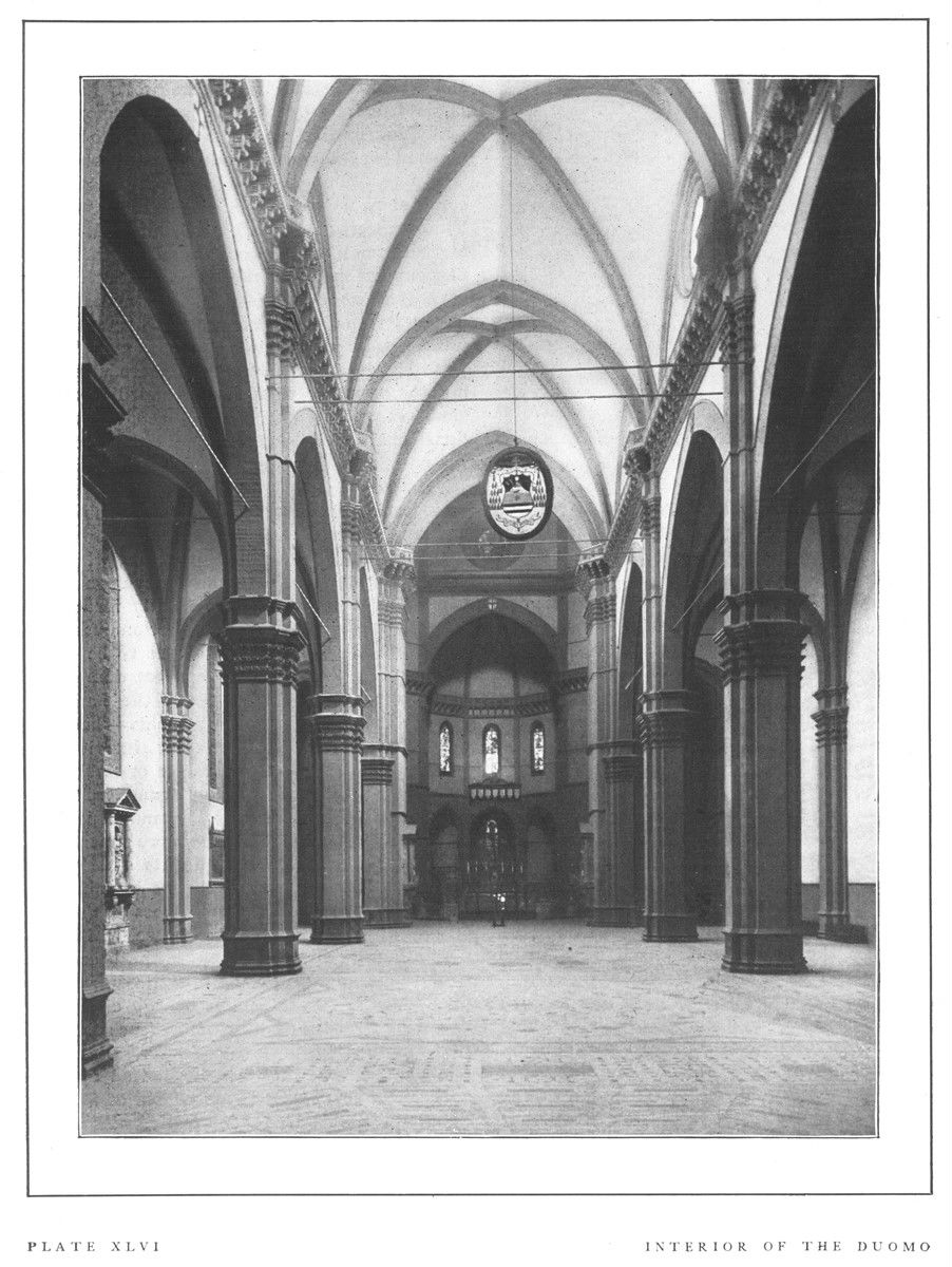 Writing of the Duomo as a whole, Mr. C. E. Norton says: "Its size gives it dignity, and its effect is powerful from the simplicity and largeness of its design. A nave of four enormous bays is stopped upon a vast octagonal space, from which, at the east, the north, and the south, are built out three pentagonal tribunes or apses, which, as seen on the outside, give to the church the common cruciform shape. The proportions of the interior are on an enormous scale, by which the apparent size of the building is diminished rather than increased. There is nothing either in the general conception or in the working-out of the details which corresponds with that principle, characteristic of the best Northern Gothic, of complex organization, in which each minor part contributes to the vital unity of the whole edifice. The Duomo presents, on the contrary, an assemblage of separate vast features arbitrarily associated, rather than united by any law of mutual relation into a completely harmonious whole. It does not display that lavish wealth of fancy in ever-changing variety and abundance of detail which gives inexhaustible charm to a true Gothic edifice. But it is impressive within from its vast open spaces, and from the stately and simple, though barren, grandeur of its piers and vaults and walls.