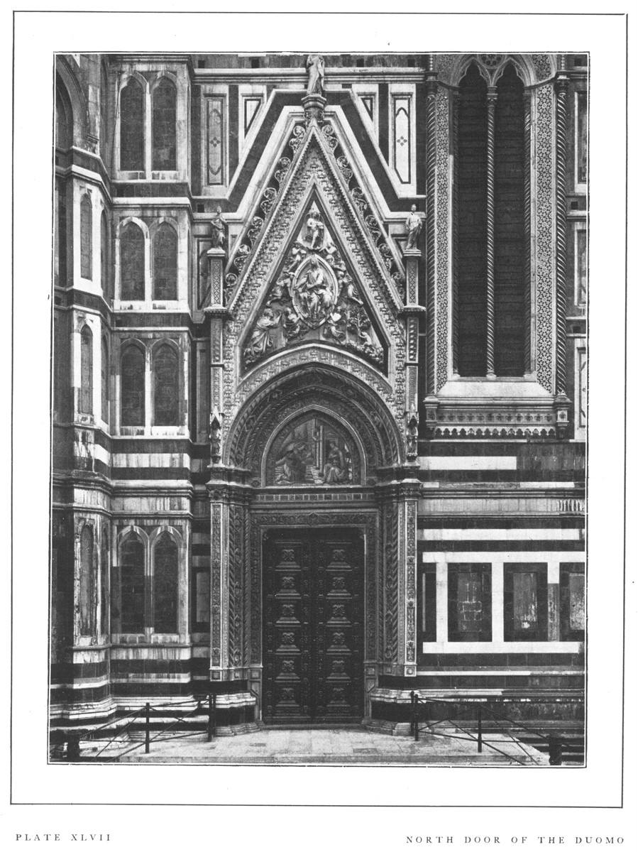 "The effect of the building from without is imposing from its mass, but, in a near view, it is only on the east that the lines compose into forms of beauty. The side walls are incrusted, after the old Tuscan style, with simple rectangular patterns of white and red marble, interrupted by the rich decoration of gable and pinnacle over the doors and windows.