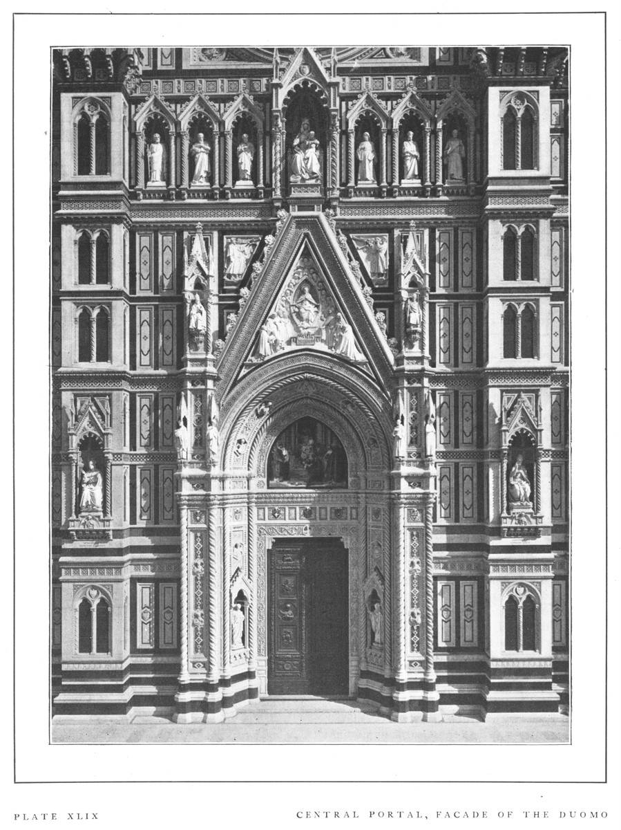 Meantime, not until some twenty years after the death of Giotto had work on the unfinished façade been recommenced. The design for it, which was Gothic, with columns and niches containing statues of the Madonna and Child, of saints and prophets, and even of distinguished Florentine citizens, was the joint composition of several architects, among them Orcagna, Gaddi and Tommasi. But this façade had only reached one-third of the height of the edifice, when, for some unexplained reason it was abandoned, and remained in an unfinished state until the reign of the Grand Duke Francis I. (1575-1587), when it was demolished to make way for the accomplishment of a new design, one which was, however, never executed; and the whole face of the Cathedral remained a bare expanse of rubble and cement until, in 1689, it was painted and frescoed to represent columns and other architectural decorations. Shortly after Tuscany was incorporated with the kingdom of Italy, the Florentine municipality again took up the matter, and invited architects to submit designs for a new façade. The design of Commendatore de Fabris, a Florentine, was selected. In 1875 the scaffolding was erected, and white marble from Seravezza, red marble from Montiere and green marble from Prato were brought to Florence to begin the façade which now exists, and which was completed and unveiled in 1887.