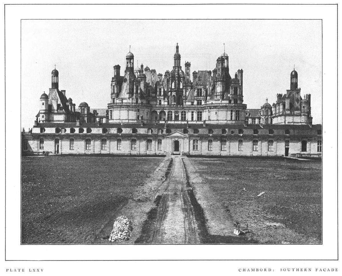 "It is not now possible to approach Chambord carrying in our eyes a vision of the great Renaissance palace, as engraved by Du Cerceau in his Plus excellens Bâtimens de la France. Burdened by the weighty labors of Louis XIV., weakened by eight improving years at the hands of Stanislaus Leszczynski, mutilated by Marshal Saxe, the Chambord which we now go out from Blois to visit is not the Chambord of Francis I. The broad foundations and heaving arches which rose proudly out of the waters of the moat no longer impress the eye. The truncated mass squats ignobly upon the turf, the waters of the moat are gone; gone are the deep embankments crowned with pierced balustrades; gone is the no-longer-needed bridge with its guardian lions. All the outlying work which gave the actual building space and dignity has vanished, and we enter directly from the park outside to what was once but the inner court of the Château.