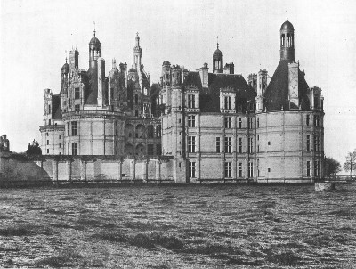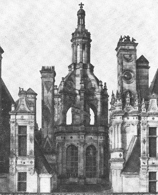 "With a sympathetic denial of any extreme over-technical admiration," writes Mr. Cook in his Old Touraine, "Viollet le Duc gives just that intelligible account of the Château which is a compromise between the unmeaning adulation of its contemporary critics and the ignorance of the casual traveller. 'Chambord,' says he, 'must be taken for what it is; for an attempt of the architect to reconcile the methods of two opposite principles,—to unite in one building the fortified castle of the Middle Ages and the pleasure-palace of the sixteenth century.' Granted that the attempt was an absurd one, it must be remembered that the Renaissance was but just beginning in France; Gothic art seemed out of date, yet none other had established itself to take its place. In literature, in morals, as in architecture, this particular phase in the civilization of the time was evident, and if only this transition period is realized in all its meanings, with all the 'monstrous and inform' characteristics that were inevitably a part of it, the mystery of this strange sixteenth century in France is half explained."