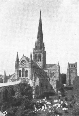 Litchfield Cathedral is sometimes styled the "Queen of English minsters," and, though surpassed by other cathedrals in age, size, grandeur of site and elaborate decoration, it has yet claim to the title because of the symmetry, proportion and picturesqueness of its general effect. It is built of red sandstone, and dates mainly from the thirteenth to the fourteenth centuries. The earliest structure on the present site was a Norman church dating from about 1100. The oldest part of the existing building is the lower part of the west half of the choir, erected about 1200. The transepts followed in 1220-40; the nave dates from 1250, and the west front from about 1280, while the Lady-Chapel belongs to the beginning of the fourteenth century. The cathedral close was formerly surrounded by a wall and moat; and in 1643 the cathedral was defended against the Puritans, who battered down the central tower and demolished many of the carvings, monuments and windows. It was, however, restored before the end of the century. The most conspicuous external features are the three beautiful spires and the fine west façade. This façade is one of the most graceful and harmonious in England; and it has the advantage over such a front as that of Peterborough in its organic connection with the rest of the building. It is covered with niches for about one hundred statues, almost all of which are now filled with modern carvings.