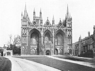 Peterborough Cathedral is one of the most important Norman churches left in England, though at first glance the exterior does not seem to bear out this assertion. The elaborate and somewhat foreign-looking west façade, with its recessed arches, gables and sculptures, is however an Early English addition of about 1220; and forms, as it were, a screen in front of the original west wall. The present building is the third church on this site. The first was destroyed by the Danes; the second was burned in 1116. The oldest part now standing is the choir, consecrated about 1140. The great transept dates from 1155-77, the late-Norman nave from 1177-93, and the west transepts, in the Transitional style, from 1193-1200. A series of uniform Decorated windows was added throughout the church in the fourteenth century. The spires and pinnacles of the flanking turrets of the west façade are of the Decorated and Perpendicular periods. The interior gives an impression of unusual lightness for Norman architecture, an effect enhanced by the color of the stone. In 1643 it suffered severely at the hands of the iconoclastic Puritans. The clearstory and triforium of the nave are impressive in size and effect. The painted wooden ceiling dates from the twelfth century.