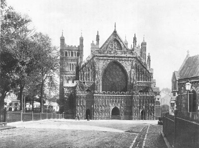Exeter Cathedral, though comparatively small and unimposing, is, in virtue of its details, one of the most admirable examples in England of the Geometrical Decorated style. The oldest existing parts of the building are the transeptal towers, dating from the early part of the twelfth century, almost unique features in English churches. The rest of the cathedral was built, or, at any rate, altered from Norman to Decorated, between 1280 and 1370, mainly from designs of Bishop Quivil. The elaborate west façade was added by Bishop Brantyngham (1370-1394). The whole has been carefully restored.
