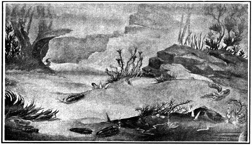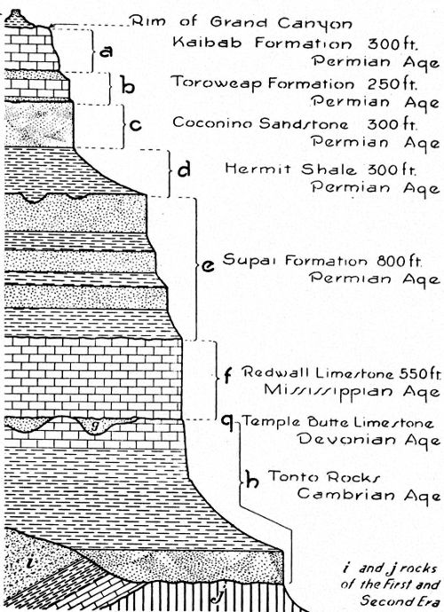 The geologist has found that two long periods of history are lacking in the great succession of ages represented by the strata in the Grand Canyon walls. These missing periods which belong to the Third Era are known as the Ordovician, the time when fish first appeared in the seas, and the Silurian, the time when millipeds and scorpions became our first air breathers. These ages immediately followed the Cambrian and involved millions of years. The absence of the first of them is explained by some geologists as the result of its rocks having been completely worn away at a later time. It seems more probable, however, that the Grand Canyon region was above sea level during these two ages so that no sediments were accumulated and consequently no rocks formed.