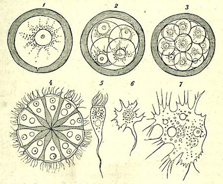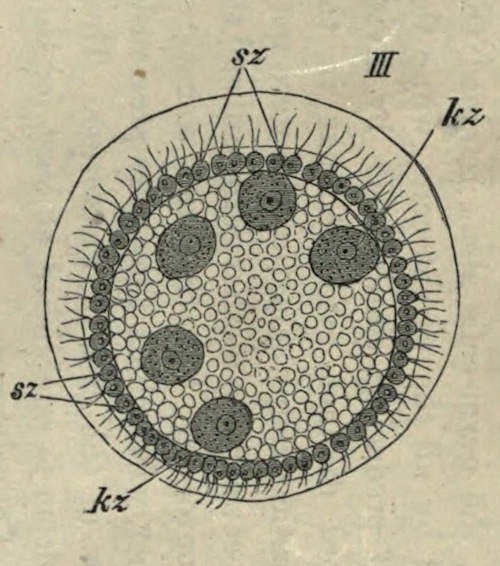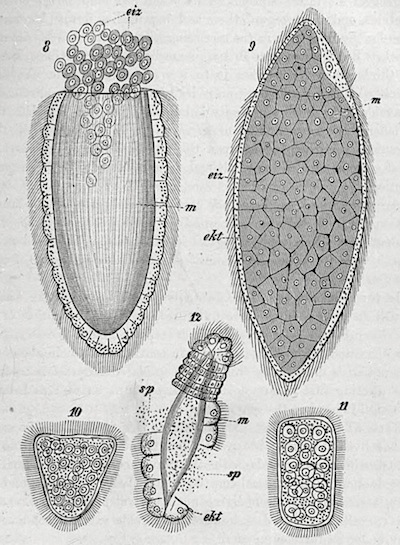 When I was speaking of the relation between duration of life and the size of the body, I might have added another factor which also exerts some influence, viz. the complexity of the structure. Two organisms of the same size, but belonging to different grades of organization, will require different periods of time for their development. Certain animals of a very lowly organization, such as the Rhizopoda, may attain a diameter of ·5 mm. and may thus become larger than many insects’ eggs. Yet under favourable circumstances an Amoeba can divide into two animals in ten minutes, while no insect’s egg can develope into the young animal in a less period than twenty-four hours. Time is required for the development of the immense number of cells which must in the latter case arise from the single egg-cell.