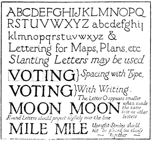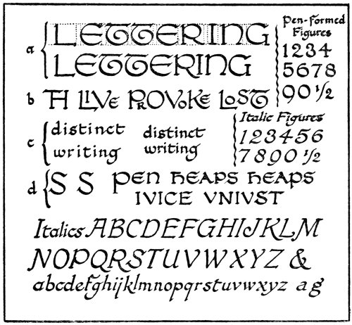In fact, lettering enters so largely into decorative design that the study of some of the fine forms of lettering is of paramount importance to any artist who desires that the lettering that he uses should be of10 good construction. So many drawings have been spoiled through the introduction of weak and badly formed lettering that the need for training the student to produce lettering that is well-finished and of good form should be obvious to everyone.