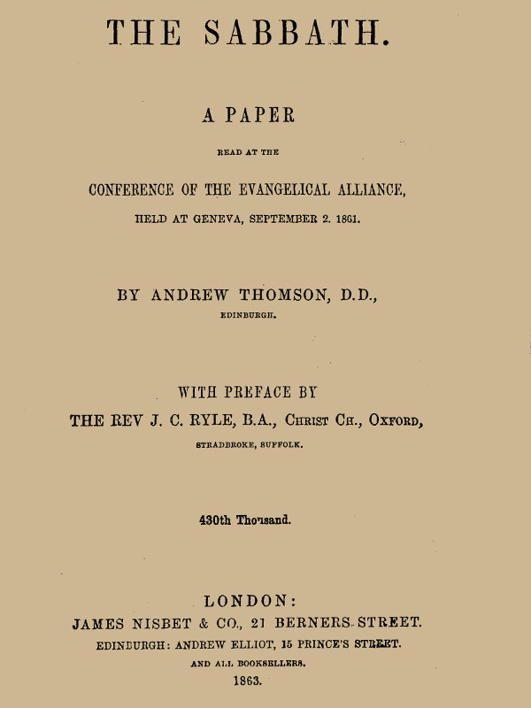 I have been requested, as an English Clergyman, to preface Dr A. Thomson's valuable paper on the Scottish Sabbath by a few recommendatory words. I comply with the request with much pleasure, though I feel that the paper needs no imprimatur of mine.