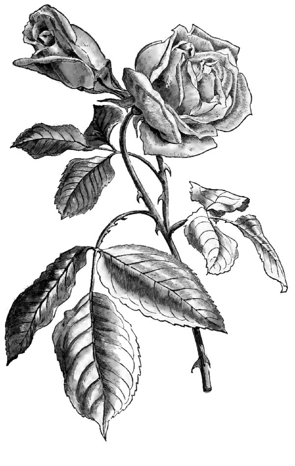 The Rose is a shrub or dwarf tree, with mostly deciduous foliage, and large, beautiful, and fragrant flowers. Its branches are slender, almost always armed with thorns, thinly furnished with leaves, which are alternate upon the stem. Its leaves are pinnate, and vary in color and character, from the rich, dark green, and somewhat rough leaf of La Reine, to the glossy smoothness and rich purple edge of Chromatella. The blossoms are variously arranged at the extremity of the newly formed branches. The calyx is single and tubular, swelling at its lower part, contracted at its opening, and divided at the edge into five lance-pointed divisions, which are whole or pinnatifid. The corolla is inserted at the mouth of the tube of the calyx, and is composed of five heart-shaped petals, which constitute the Rose in its single or natural state. The double blossoms are formed by the change of the stamens and pistils into petals or flower leaves, shorter than those of the corolla proper. The fruit or seed vessel, or hip, is formed by the tube of the calyx, which becomes plump and juicy, globular or oviform, having but one cell, and containing numerous small, one-seeded, dry[Pg 8] fruits, which usually pass for seeds; these are oval or globular, and surrounded with a soft down. The wood is very hard and compact, and of fine grain; and if it could be procured of sufficient size, would serve as a substitute for box in many kinds of manufacture. The longevity of the Rose is, perhaps, greater than that of any other shrub. We recollect seeing a rose-tree near an old castle in Stoke Newington, England, the stem of which was of immense size, and indicated great age. “There is a rose-bush flourishing at the residence of A. Murray McIlvaine, near Bristol, (Penn.,) known to be more than a hundred years old. In the year 1742, there was a kitchen built, which encroached on the corner of the garden, and the masons laid the corner-stone with great care, saying ‘it was a pity to destroy so pretty a bush.’ Since then, it has never failed to produce a profusion of roses, shedding around the most delicious of all perfumes. Sometimes it has climbed for years over the second-story windows, and then declined by degrees to the ordinary height. The fifth generation is now regaled with its sweets.”