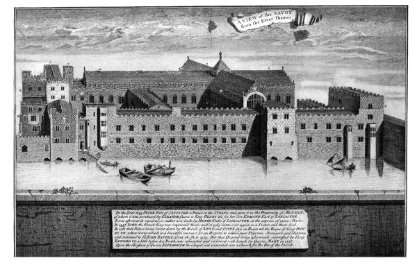 The Palace of the Savoy also needs some notice. The original house was built by Peter, brother of Boniface, for so many years Archbishop of Canterbury, and uncle of Eleanor of Provence, wife of King Henry III. By his will Peter bequeathed this estate to the monks of Montjoy at Havering-at-Bower, who sold it to Queen Eleanor, and it became the permanent residence of her second son Edmund, Earl of Lancaster, and his descendants. When King John of France was made a prisoner after the battle of Poitiers in 1356, he was assigned an apartment in the Savoy, and here he died on April 9, 1364. The sad event is thus mentioned in the famous chronicle of Froissart:—