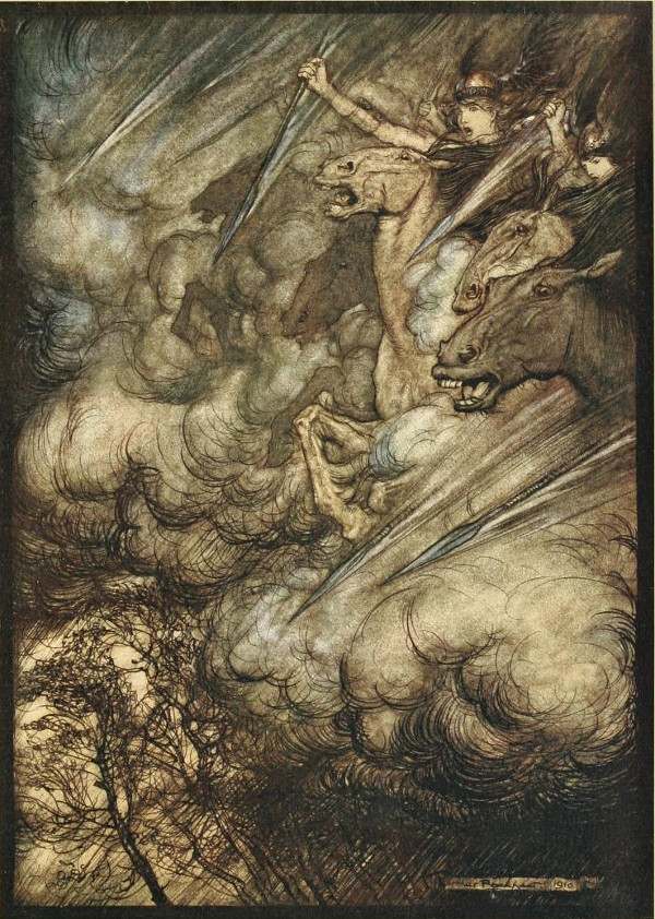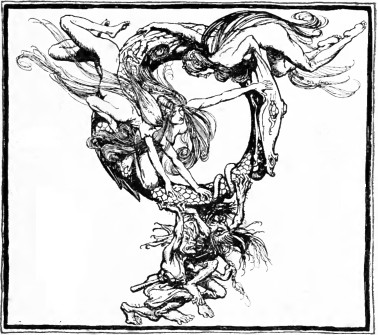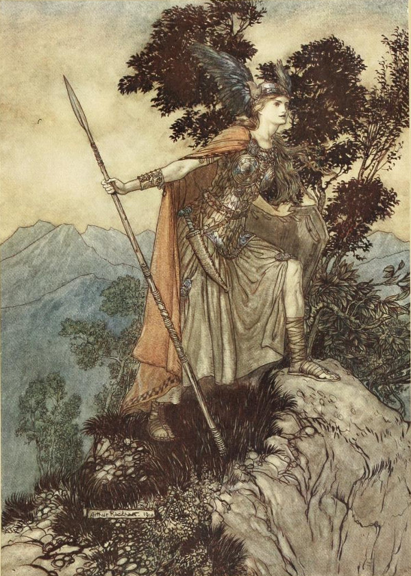 Brünnhilde with her horse, at the mouth of the cave plate 28