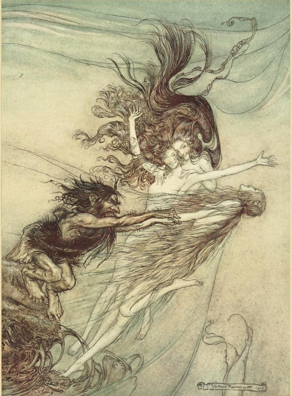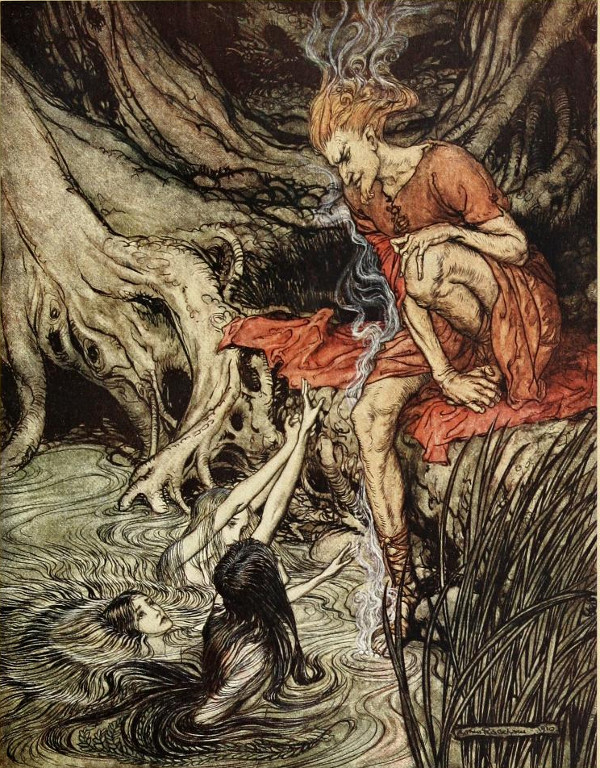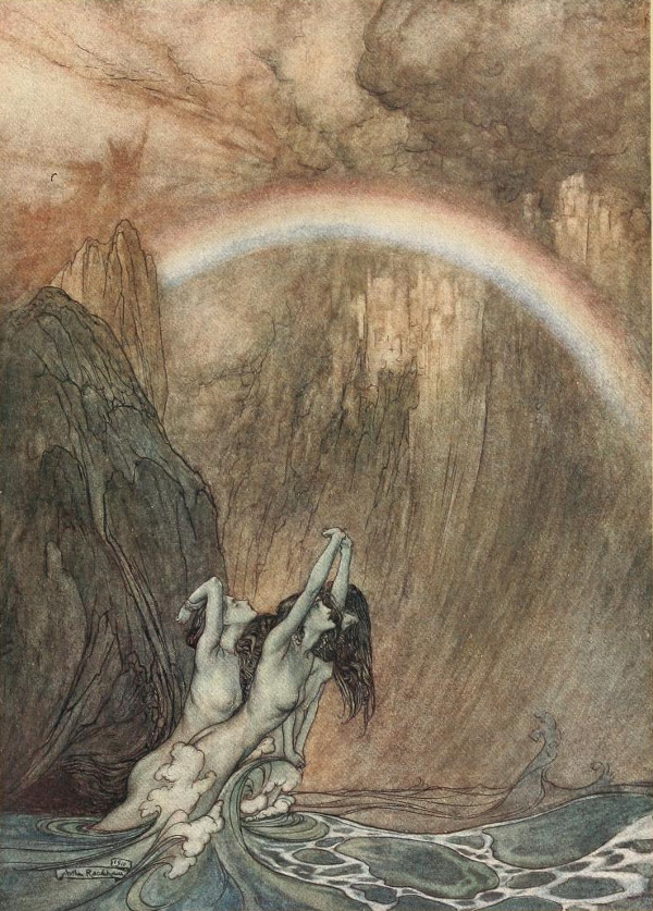 A greenish twilight, lighter above than below. The upper part is filled with undulating water, which streams respectively from right to left. Towards the bottom the waves resolve themselves into a mist which grows finer as it descends, so that a space, as high as a mans body from the ground, appears to be quite free from the water, which floats like a train of clouds over the gloomy stretch below. Steep rocky peaks jut up everywhere from the depths, and enclose the entire stage. The ground is a wild confusion of jagged rocks, no part of it being quite level, and on every side deeper fisures are indicated by a still denser gloom. Woglinde circles with graceful swimming movements round the central rock.