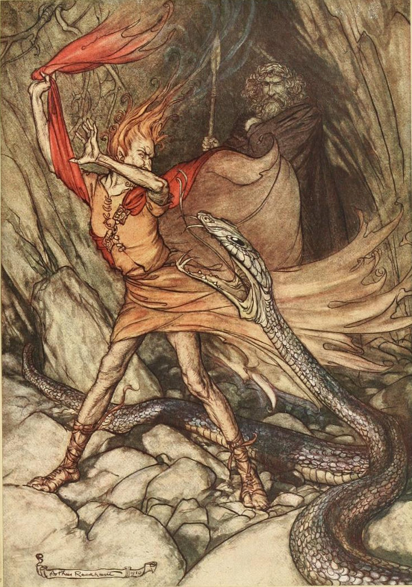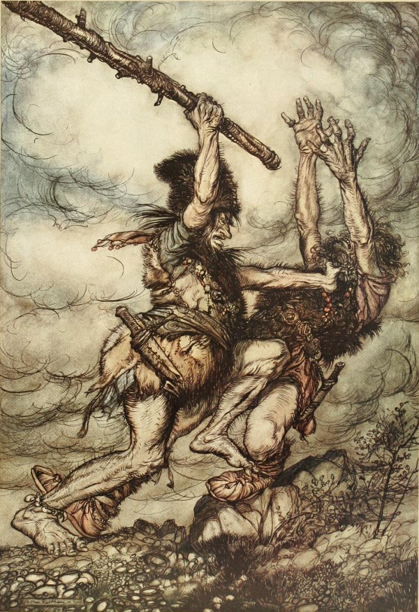 Fasolt suddenly seizes Freia and drags her to one side with Fafner plate 08