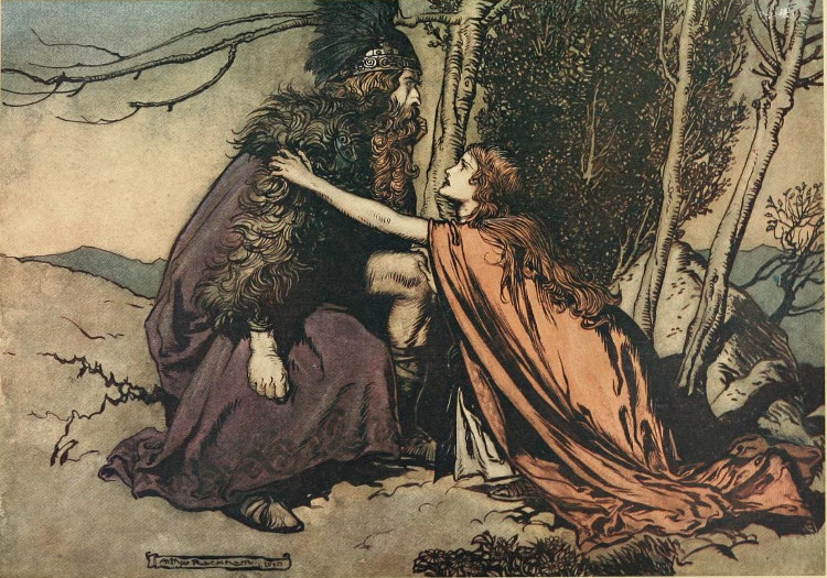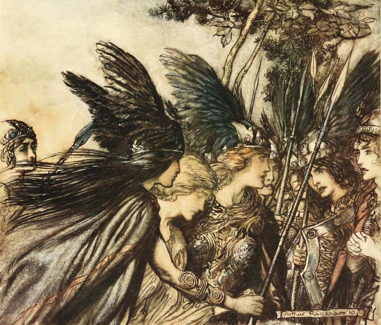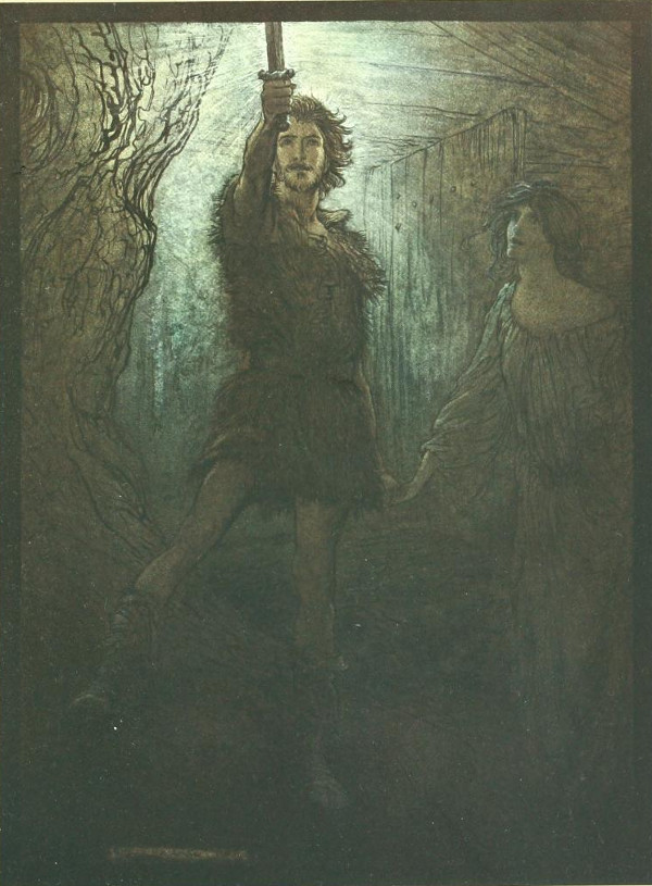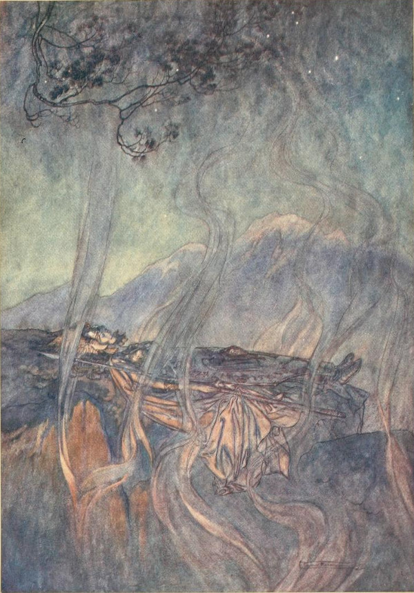 [He kisses her long on the eyes, and with these closed she sinks back softly into his arms, unconscious. He carries her gently to a low mossy mound, and lays her there beneath the broad-spreading pine-tree which overshadows it. He gazes at her and closes her helmet; his eyes then rest on the form of the sleeper, which he completely covers with the great steel shield of the Valkyries. Having done so, he moves slowly away, turning to take one more sorrowful look. Then he strides with solemn resolve to the middle of the stage, and points his sword towards a large rock.